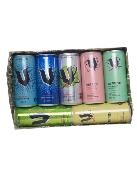 The V Energy Pack includes seven assorted 250ml cans of V Energy drinks, providing a refreshing energy boost with caffeine, taurine, and B vitamins. Perfect for athletes, students, and anyone needing sustained energy and focus. Buy online today!